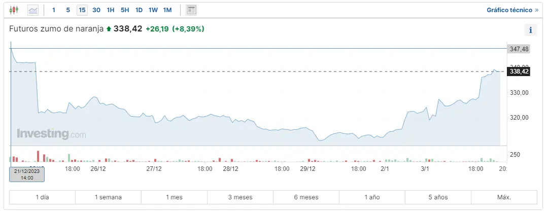 Gráfico de las cotizaciones del zumo de naranja en un espacio de tiempo de un día