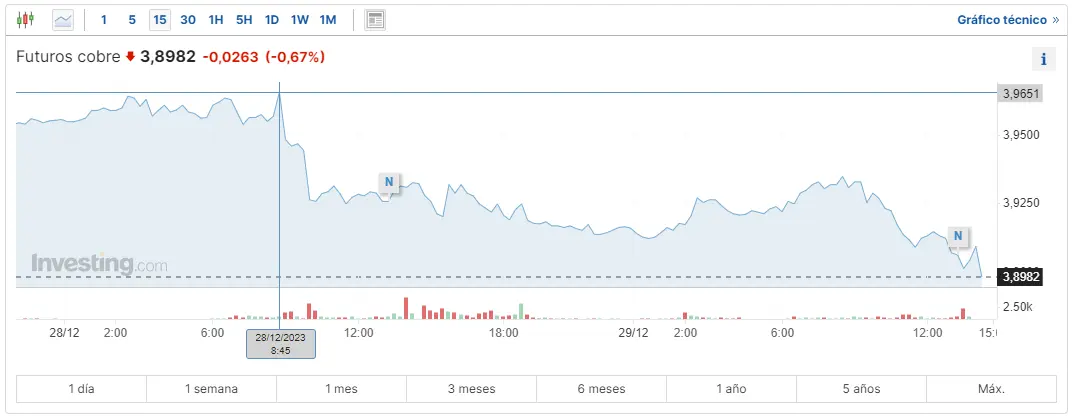 El precio del cobre se está perdiendo en unos valores que encuentran los valores actuales en unos niveles de unos 38982 dólares, con unas caídas que siguen sumando niveles bajistas de hasta un 0.67%, bajándose unos 0.0263 dólares por el cobre, perdiendo un gran paso bajista desde sus máximos de 3.9651 puntos hacia los mínimos de apenas unos valores de 3.8982 dólares como los del momento actual. No nos espera nada bueno en los resultados que veremos en los próximos días.