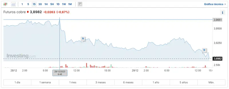 Gráfico de las cotizaciones del cobre en un espacio de tiempo de un día