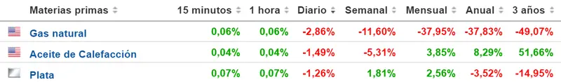 Tabla con las cotizaciones de lo datos de las materias primas