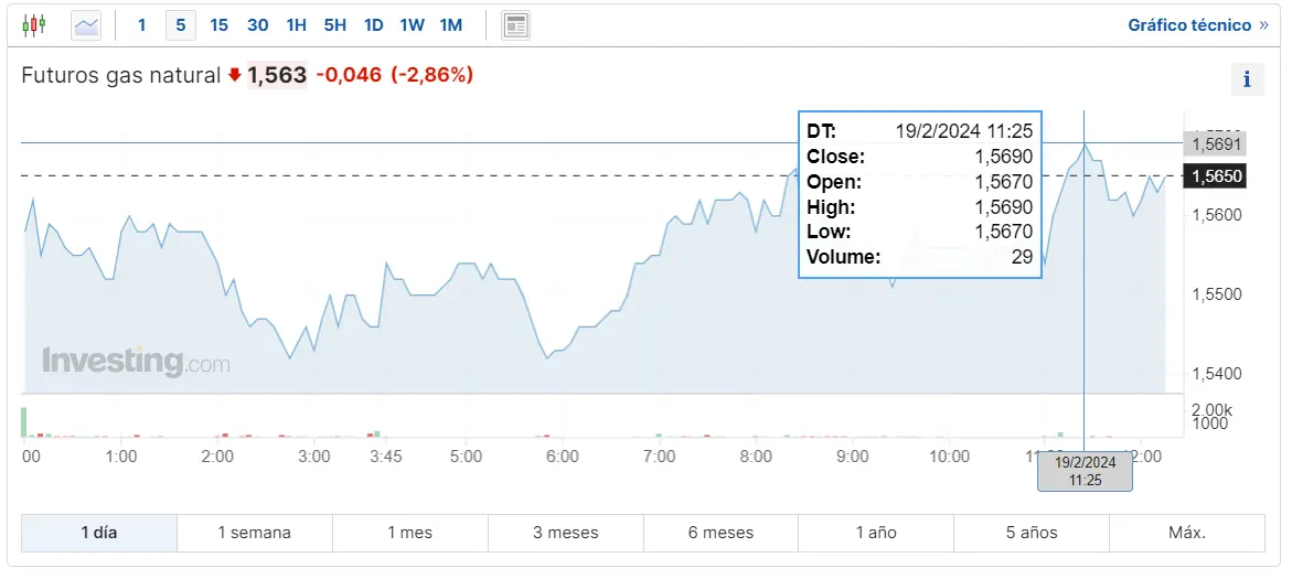Gráfico de las cotizaciones del gas natural en un espacio de tiempo de un día