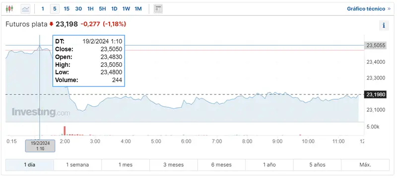 Gráfico de las cotizaciones de la plata en un espacio de tiempo de un día