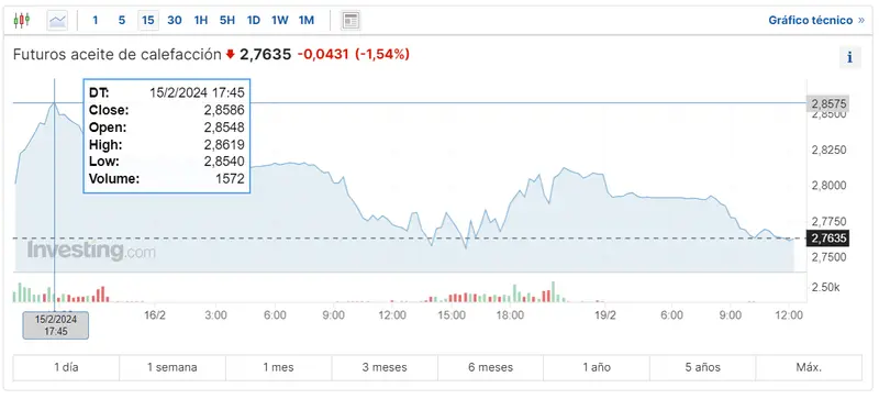 Los datos hablan por si solos. Ahora mismo las cotizaciones del aceite de calefacción caen unos 0.0431 dólares (USD), bajando el porcentaje de un 1.54%, retumbando desde valores muy fuertes y muy altos de unos 2.8619 dólares a cotizaciones actuales de 2.7635 dólares y unos posteriores valores mínimos de apenas unos 2.8540 dólares, bajando cada vez más.