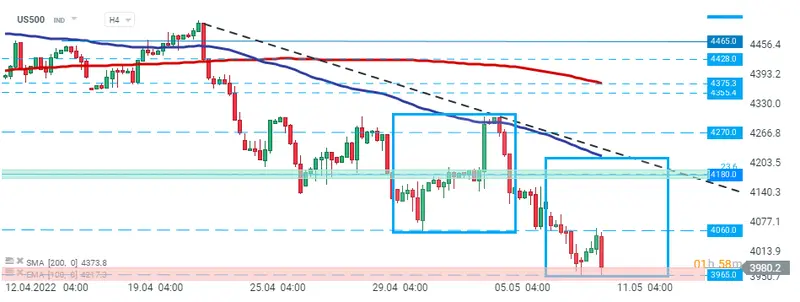 US500 retrocedió hacia los mínimos de ayer en 3965 pts. En caso de que se produkzca una ruptura a la baja, el movimiento a la baja puede acelerarse hacia el siguiente soporte importante en 3800 pts, lo que coincide con el retroceso de Fibonacci del 38,2% de la ola alcista lanzada en marzo de 2020 . Por otro lado, si los compradores logran recuperar el control, otro impulso alcist hacia la resistencia clave a 4180 pts Przejía ocurrir. Fuente: xStation5