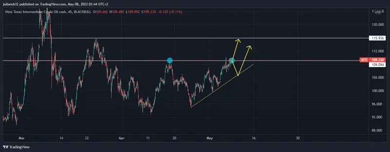 China demanda mucho petróleo pero su encierro provoca menos demanda, lo cual debería provocar una bajada en el petróleo, pero el limitante ahora es la oferta que se restringida por sanciones a Rusia, países de occidente no les conviene ese limitante pero lo ponen por seguridad energética, aunque esto afecte a las personas, piensan más por intereses imperialistas, la solución es arreglar el conflicto y llegar acuerdos, los dos pierden, occidente un precio de petróleo más caro y Rusia deja de recibir ingresos, el mundo es un caos y hay soluciones que se pueden tener si se vence el ego , el precio de petróleo está en una estructura alcista y favorece a compras, actualmente está luchando con una zona de resistencia de romperla es factible que el precio suba a la zona de los 115 y puede encontrar soporte con los mínimos crecientes que forman una línea de tendencia de soporte como se observa en el siguiente gráfico: