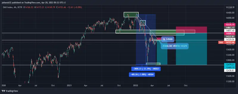 Es el escenario base para los próximos años una recesión provocada por los bancos centrales, por eso el punto de vista fundamental favorece es a ventas, si suben tipos de interés esperaremos un estancamiento que dure unos trimestres y después hay será la oportunidad de compra pero esperando que la inflación también baje y los bancos centrales tengan la maniobra para implementar otra vez políticas expansivas, el DAX se encuentra todavía en una zona cerca de máximos históricos, por eso no descartaría grandes correcciones y lo que le puede dar un empujón hacia los máximos y cancelaria mis hipótesis es una Paz entre Rusia y Ucrania , esto generaría que se nivelaran otra vez los precios de las energías que afectan la inflación y tuvieran otra vez maniobra el BCE.