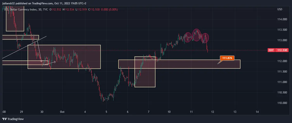 En la sesión del martes el índice del dólar baja y estaba formando un hombro cabeza hombro, actualmente baja 0,61% y se ubica en la zona de 112.515, el DXY podría encontrar soporte en los 111.876.
