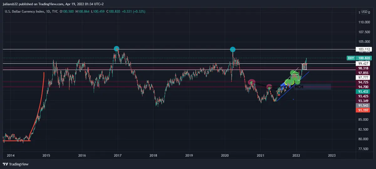 El DXY (Indice del dólar estadounidense) se dispara en las últimas sesiones por comentarios de la reserva federal que apunta a una política más agresiva.