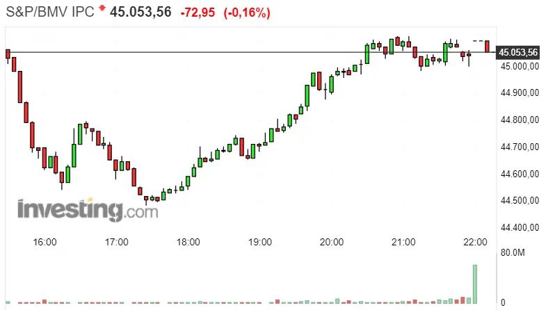 Vemos el índice S&P/BMV IPC en pendientes descendentes, que van dejando la bolsa mexicana en rojo, con unas cotizaciones de unos 45053.56 puntos, tras bajadas de unos 72.95 puntos. Las cotizaciones del momento actual van oscilando entre dos posiciones, se trata del nivel de soporte y el de resistencia, ambos valorados en 44487.19 y 45112.62 puntos respectivamente.
