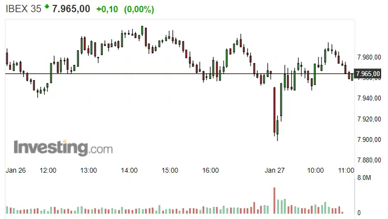Esta mañana vemos el índice español Ibex 35 en verde, con unas cotizaciones de 7965 puntos. Esto último nos va marcando ascensos de tan sólo unos 0.1 puntos. Si nos fijamos mejor en su trayectoria veremos dos niveles de nuestro interés; el nivel de resistencia y el nivel de soporte. El primero de ellos lo vemos en unos 7995.18 puntos, quedándose el nivel de soporte en unos 7899.32 puntos. No perdamos de vista el salto de nivel del día de ayer en el que las cotizaciones del índice español pasaban de 7959.50 puntos a unos 7955.24 puntos.