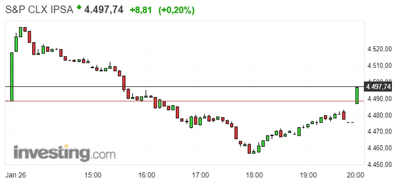 El índice chileno S&P CLX IPSA sigue manteniendo su color verde de ascensos de unos 8.81 puntos, es decir; del 0.20%. Las cotizaciones del momento actual son de unos 4497.74 puntos oscilando en todo momento entre dos picos que se convierten en los puntos de soporte y resistencia. El nivel de resistencia es el que vemos en unos 4533.29 puntos, mientras que el nivel de soporte lo vemos en unos 4457.49 puntos. Debemos tener en cuenta el reciente salto que elevaba la Bolsa chilena de unos 4475.98 puntos a unos 4487.77 puntos.