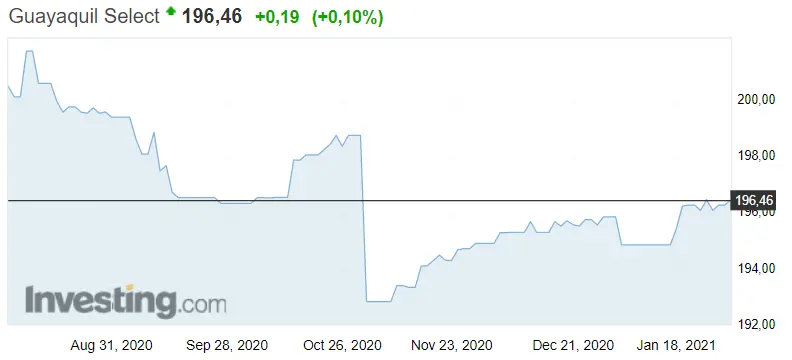 Como vemos en el gráfico de abajo, las cotizaciones del índice Guayaquil se mantienen en verde, lo que nos indica subidas, en este caso de 0.19 puntos; 0.10%, con una situación actual de 196.46 puntos. En la trayectoria del índice ecuatoriano observamos dos niveles de interés, e primero de ellos es el nivel de resistencia, visto ni más ni menos que en 198.74, mientras tanto, el nivel de soporte es propio de unos 192.84 puntos.
