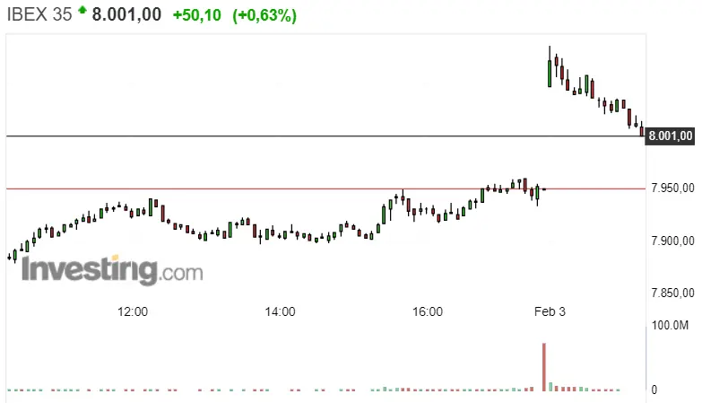 El día de hoy podemos observar impulsos en el Ibex 35, que lo alzan en un 0.63%, es decir en 50.10 puntos, hacia niveles como el de 8001 puntos del momento actual. Por tanto, podemos decir que las cotizaciones del índice español permanecen en verde, menteniéndose entre su nivel de soporte y el de resistencia. El primero de ellos se encuentra en unos 7983.77 puntos, mientras que el segundo se encuentra en 8086.81 puntos. En el Ibex podremos esperar influencia de la publicación de los datos del PMI de servicios de España de esta mañana, que afectan directamente al euro. Respecto a las cotizaciones del índice español, tampoco perdamos de vista el salto de nivel de 7955.20 puntos a unos 8047 puntos.