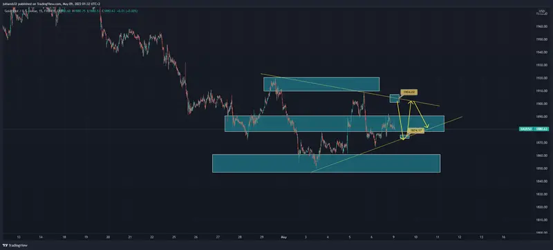 El oro está formando un rango de consolidación además de una estructura triangular, la zona clave de resistencia del rango está en la zona de los 1917 usd y la zona de soporte en los 1850, el precio en las últimas sesiones viene marcando máximos cada vez menores y mínimos cada vez menores, el precio puede ir en búsqueda de la resistencia en la figura triangular del precio en la zona de los 1904 usd y soporte en los 1874 usd ,este escenario puede ser aprovechado por los participantes del mercado que están buscando compras como los participantes del mercado que están buscando ventas, el precio puede ir estrechándose en las próximas sesiones en esa figura triangular a la espera de datos para coger una dirección como se observa en el siguiente gráfico:
