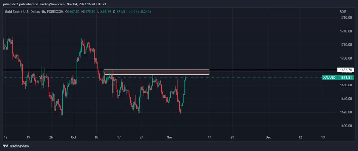 El precio del oro se vio afectado en días anteriores, por el hecho de que la Reserva Federal subió los tipos de interés al 4%. El oro visitó los mínimos de este año en la zona de los 1.618 USD, pero ya se recuperó de ese movimiento, y ahora está en una zona clave de resistencia. El oro este año se está viendo perjudicado por subidas de los rendimientos de los bonos en Estados Unidos, y las posibles correcciones alcistas podrían favorecer a los vendedores. En la sesión actual, el oro frente al dólar americano se ubica en la zona de los 1.671,34 USD, lo que representa una subida de +41,69 USD y una variación positiva de +2,56%.