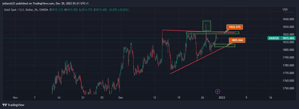 El precio del oro en el mes de diciembre llego a un máximo en los 1.833 USD, el precio en la sesión actual se encuentra en la zona de los 1.815 USD, y el precio podría encontrar soporte en los 1.805 USD y resistencia en los 1.822 USD.