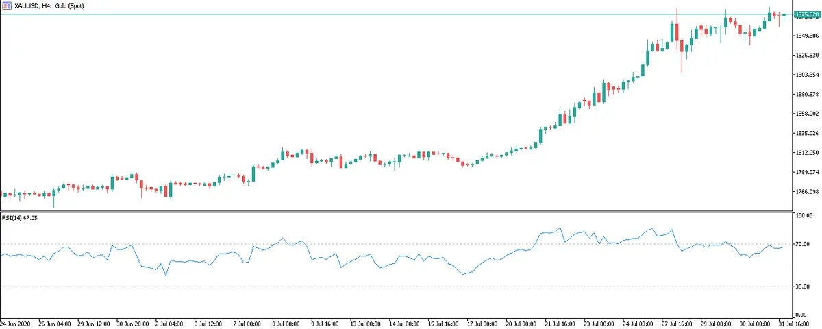El metal dorado ha dado él estiròn a lo largo de las últimas semanas, pero quien diría que alcanzaría nuevos máximos históricos, mientras sitúa su nivel de cambio en 1.975,02 dólares por onza al cierre siendo, la cotización de inicio de la semana en curso 1.902,51 dólares por onza lo cual, nos da una variación porcentual de un 3,8%. Sin embargo, tras el registro de una fuerte barrera en forma de un triple techo el metal dorado da indicios de un nuevo ataque al nivel máximo histórico. El indicador “RSI” (Relative Strength Index) continua de parte del mercado del oro mostrando fuerza alcista y margen para continuarla, mientras sitúa su nivel en “67”.
