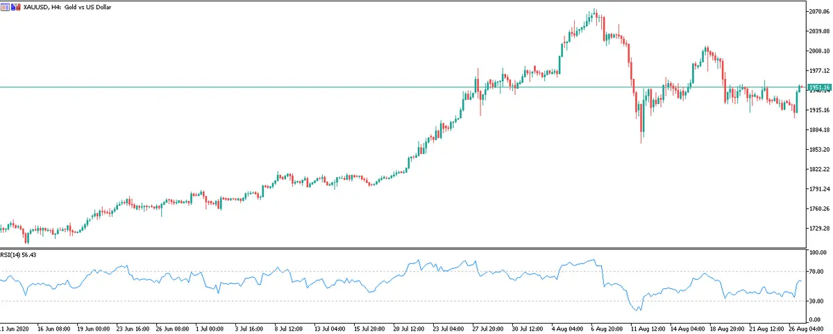 El Metal Dorado vuelve a la carga y parece apuntar alto. Ahora bien, el Oro parece haber encontrado su suelo estrella en torno a los 1.900 Dólares mientras, sitúa su nivel de cambio en 1.951,16 Dólares por Onza. Veamos qué información podemos obtener del indicador “RSI” (Índice de Fuerza Relativa).