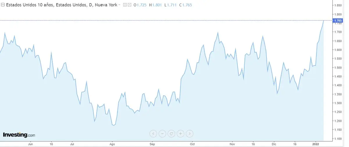 Gráfico que muestra la rentabilidad de los bonos a 10 años que han cerrado la semana con una subida del 1.76%. Si en las próximas sesiones su rentabilidad supera el 2%, el mercado podría sufrir una seria corrección