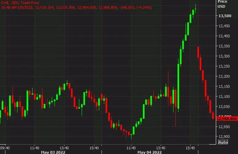 Llevamos una hora de negociación de acciones de EE. UU. y no hay una sola vela verde en el gráfico de 15 minutos del Nasdaq.