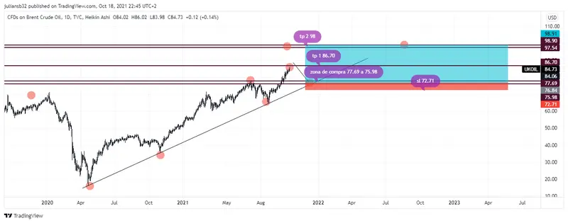 Desde el punto de vista estructural en el petróleo de referencia Brent favorece a compras. La estructura nos da un canal alcista con 3 correcciones a la zona de línea de soporte de un canal y se esperaría una 4 corrección en la zona aproximada entre los 77.69 y los 75.98, la cual sería una buena zona para retomar la tendencia y la estructura del canal para compras y con un stop loss por debajo de la zona de soporte como se observa en la siguiente gráfica: