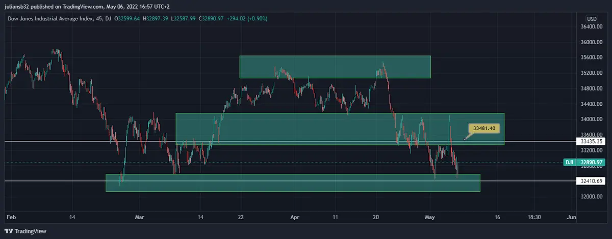 Gráfico del índice del Dow Jones en temporalidad de 45 minutos fuente –tradingiview