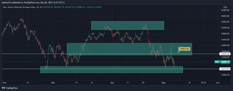Dow Jones se enfrenta a la zona de soporte de los mínimos del mes de febrero, lo ha hecho menos peor que el índice del Nasdaq y puede rebotar significativamente hasta la zona de equilibrio de los 33481.40 puntos, esta zona de equilibrio se toma como referencia desde el mes de febrero que fue cuando marco mínimos hasta la actual, el precio esta una rango de consolidación como se observa en el siguiente gráfico: