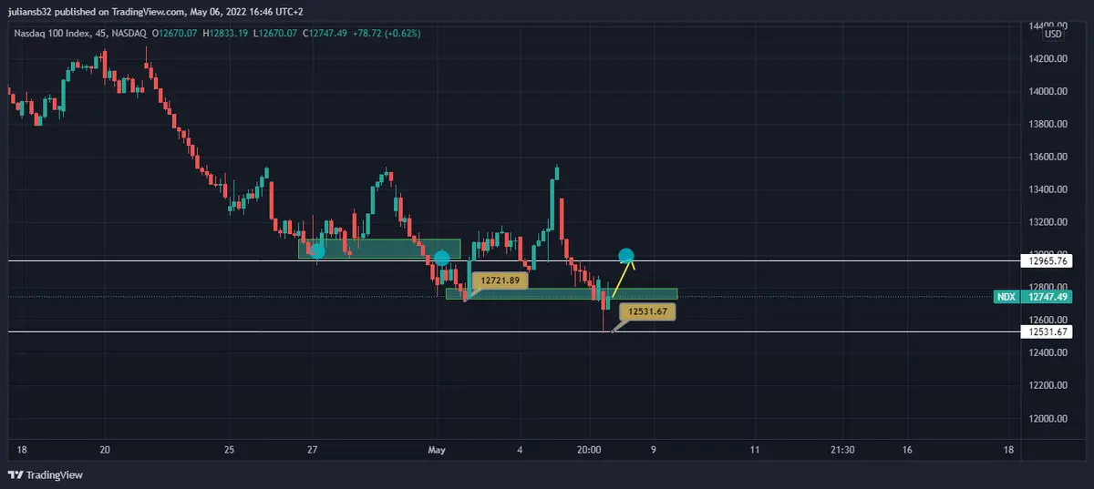Gráfico del índice del Nasdaq 100 en temporalidad de 45 minutos fuente –tradingiview