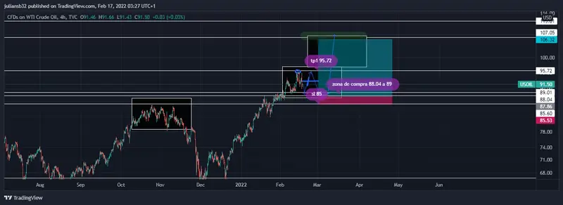 Desde el punto de vista estructural del petroleó de referencia WTI, favorece a compras, el precio se está limitando por una zona de resistencia pero lo más probable es que en las próximas correcciones se aproveche para compras y rompa la zona de los 96 usd y busque nuevos máximos, la zona que puede ser como primer soporte esta entre los 89 usd a 88 usd, para ir en búsqueda del máximo registrado en estos días, el precio corrigió un poco por que las tensiones entre Rusia y ucrania mejoraron un poco, y de romper la zona de los 96 usd el precio podría ir en búsqueda de los 107 usd, en el siguiente grafico se expone lo anterior:
