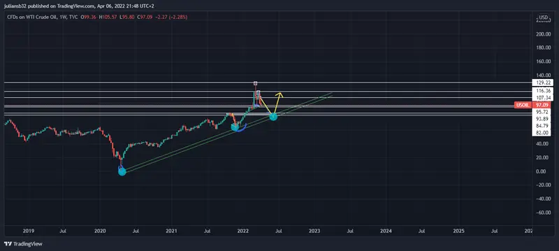 Uno de los activos más volátiles en este 2022 con escenarios de guerra y demanda altísima por crecimientos económicos a nivel mundial, lo cual era respaldado por la gran liquidez que se generó a partir del covid, con el fin de no dejar caer la economía, ahora el petróleo de referencia WTI se encuentra en una fase correctiva, después de marcar máximos en la zona de los 130 USD por barril, lo que alarma bastante es que siga el conflicto entre Rusia y Ucrania.
