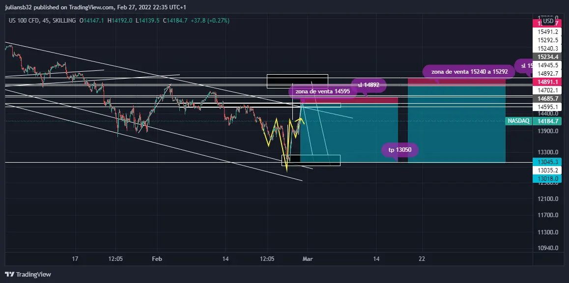 En el Nasdaq se observa como se ha recuperado casi un 10% después de mínimos, el precio estructuralmente rompió una estructura alcista y favorece a ventas, además del riesgo geopolítico que sigue latente, el precio está formando un hombro cabeza hombro que sigue favoreciendo a recuperación para llegar a zonas estratégicas para ventas, como se plantea en el siguiente gráfico: