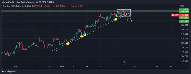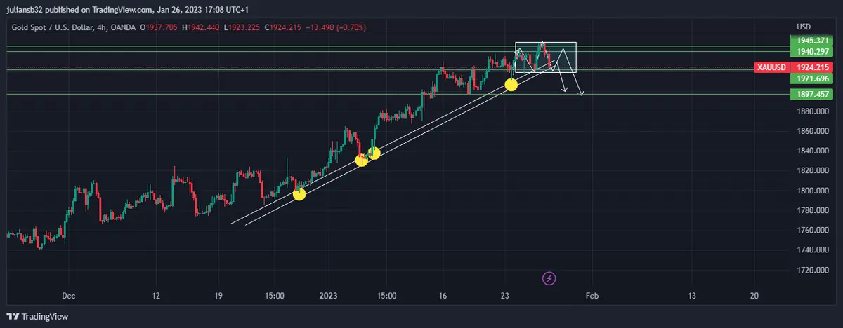 En la sesión actual, el precio del oro frente al dólar estadounidense corrige, al no poder pasar la barrera de los 1.950 USD, y ahora está por debajo de los 1.930 USD. El oro está en una estructura alcista, los fundamentales en el corto plazo podría hacer atacar la zona de soporte de la estructura alcista, y romperla para cambiar a estructura bajista e ir en búsqueda de los 1.900 USD.