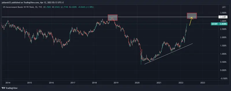 Grafica de los rendimientos de los bonos en Estados Unidos a 10 años - fuente tradingview.
