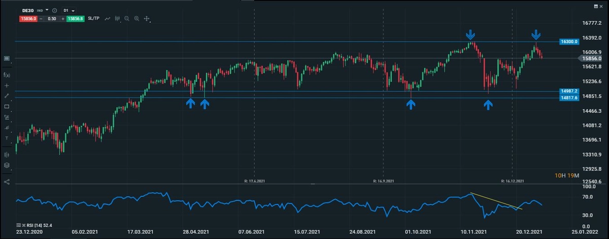 Gráfico actualizado del Dax40 en una temporalidad diaria, de rebasar los suelos que se encuentran en 14187 puntos, se podría estar confirmando un doble techo.