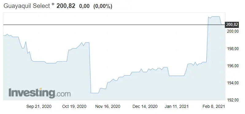 Como vemos en el gráfico de abajo, las cotizaciones del índice Guayaquil se dirigen de nuevo hacia el sur con una situación actual de 200.82 puntos. Lo que iba sucediendo desde hace un tiempo era una situación en la que de los 194.85 puntos el índice bajaba hacia los 201.77 que se iban manteniendo desde el 5 hasta el 11 de febrero. Es entonces cuando se desencadena la bajada de las cotizaciones del índice Guayaquil que concluye en el momento actual. ¿Qué factores podrían impulsar al índice en cuestión?