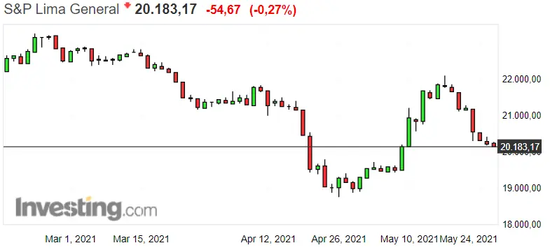 La Bolsa peruana permanece más cerca de los niveles de soporte que de los de resistencia. En el índcie S&P Lima General lo que podemos ver es una actual bajada, lo que significa que su mercado sigue iluminado en rojo, manteniendo un nivel de 20183.17 puntos. Vemos en el gráfico de abajo, nieveles de soporte del índice peruano no demasiado más bajos al actual; se trata todavía de unos 23293.38 puntos, a los cuales descendía el S&P Lima General desde los niveles que consideramos de resistencia; 18786.61 puntos. ¿Debemos esperar impulsos alcistas o todavía no es el momento? En estos instantes, las pérdidas son de 54.67 puntos.