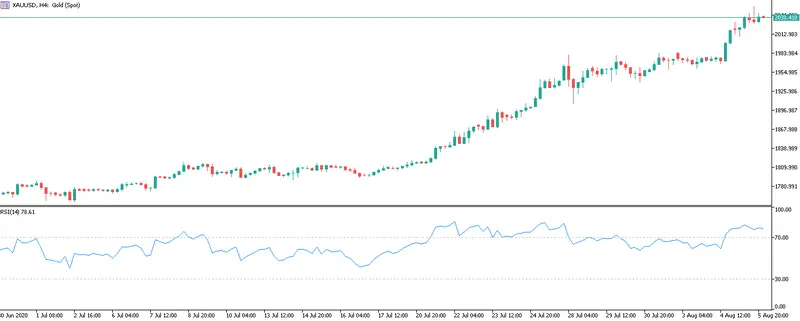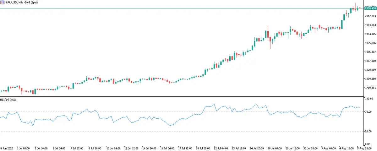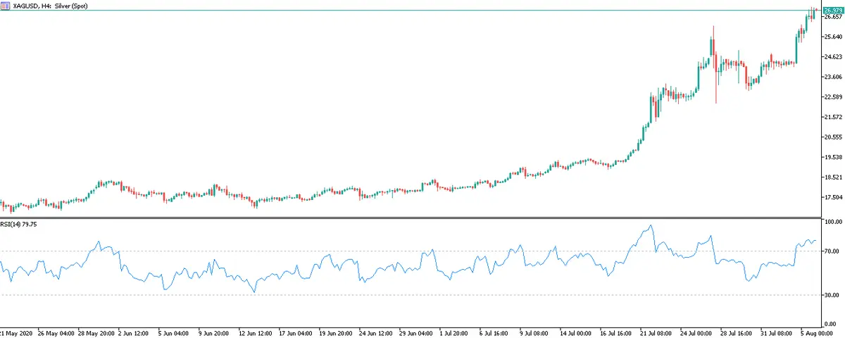 Los metales preciosos no dan tregua! Y es que el metal dorado tiene nuevo récord histórico registrado durante la jornada en curso, mientras sitúa su nivel de cambio en 2.038,41 Dólares por Onza además, la Plata no se queda atrás y continúa apuntando hacia las estrellas, mientras sitúa su cotización en 26,97 Dólares Estadounidenses. Qué información obtenemos del el indicador de Fuerza Relativa “RSI”?
